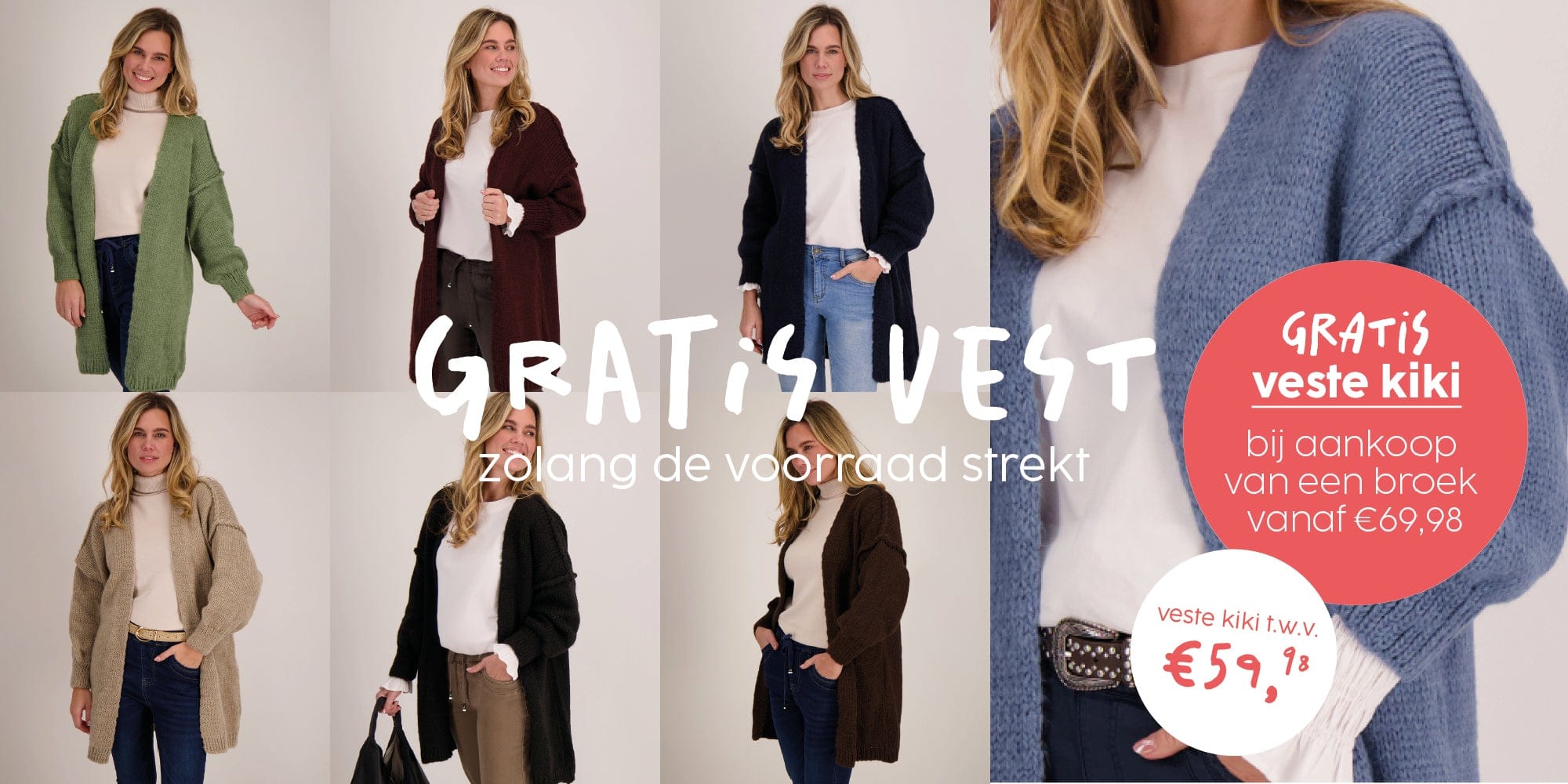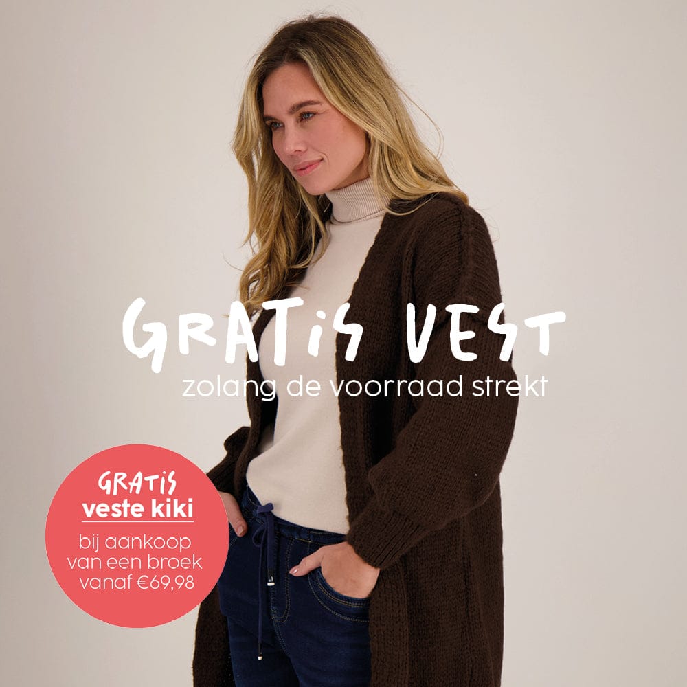 Bij aankoop van een broek vanaf €69,98 ontvang je Veste Kiki t.w.v. €59,98 cadeau zolang de voorraad strekt.