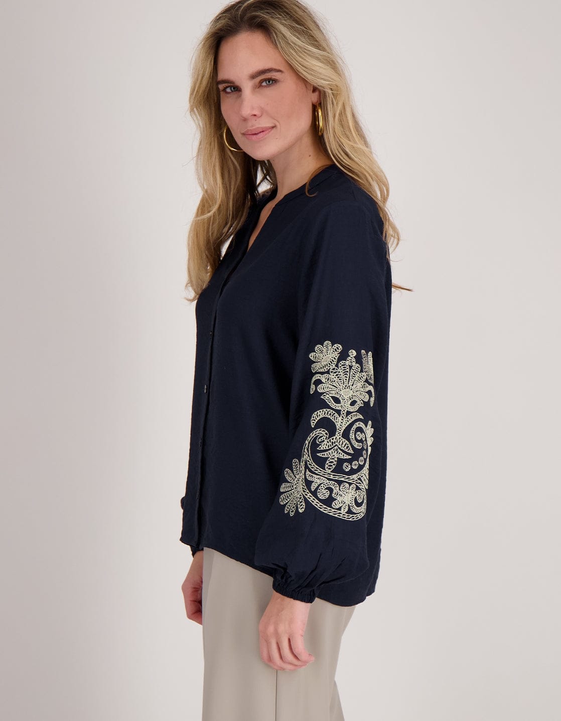 • Embroidery met subtiele glans op de mouwen