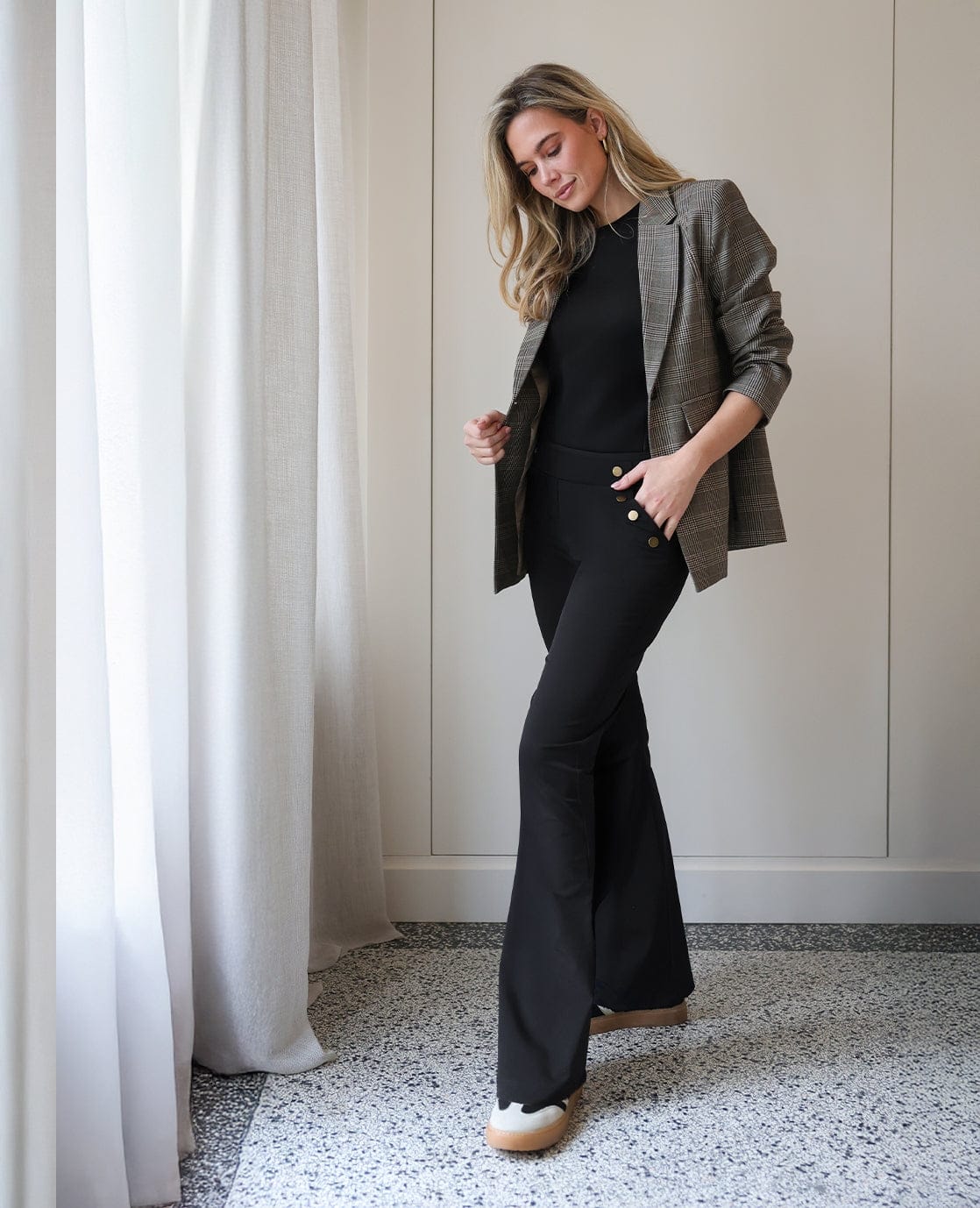 • Broekspijpen lopen uit in charmante flare