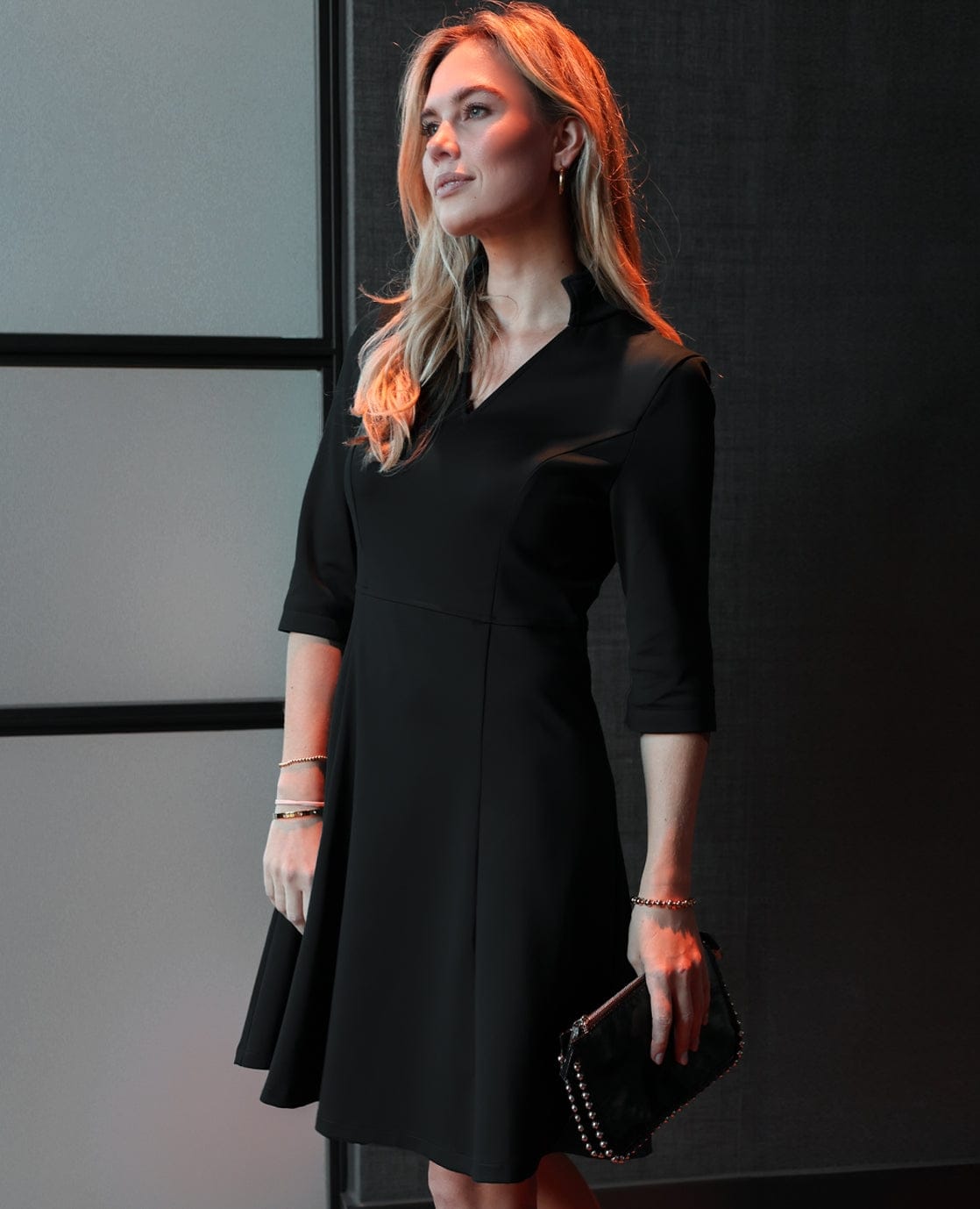 • Jurk met v-hals en staande kraag