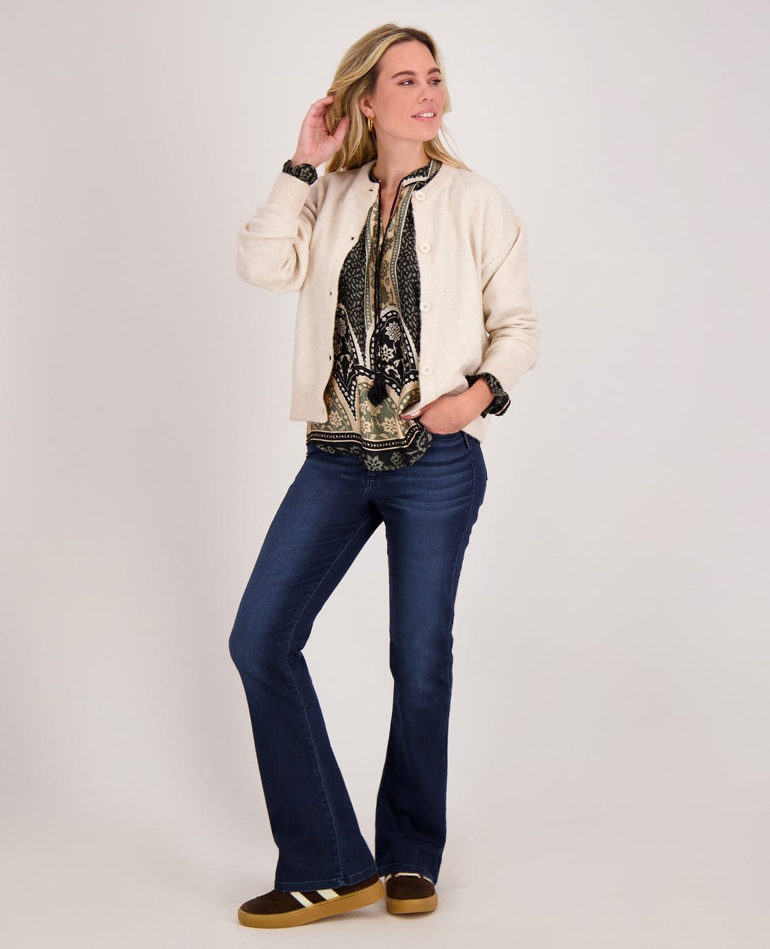 Terlène is een slimme mix van polyester en viscose, eventueel met een vleugje elastaan, die eruitziet als een stijlvolle tailormade stof maar aanvoelt als comfortwear. Licht, soepel, onderhoudsarm – en altijd elegant.